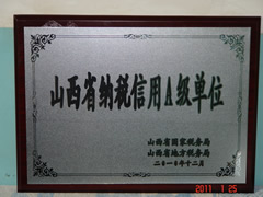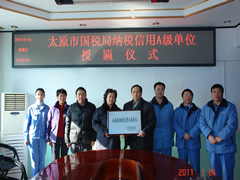 2011年1月25日,我公司榮獲省國(guó)稅、地稅聯(lián)合頒發(fā)的“山西省納稅信用A級(jí)單位”榮譽(yù)稱號(hào)。