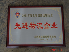 2012年2月8日,在山西省道路運輸工作會議上,我公司獲得由山西省交通運輸管理局頒發(fā)的2011年度全省道路運輸行業(yè)《先進物流企業(yè)》榮譽稱號。