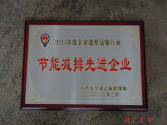 2012年2月8日,在山西省道路運(yùn)輸工作會(huì)議上,我公司獲得由山西省交通運(yùn)輸管理局頒發(fā)的2011年度全省道路運(yùn)輸行業(yè)《節(jié)能減排先進(jìn)企業(yè)》榮譽(yù)稱號(hào)。