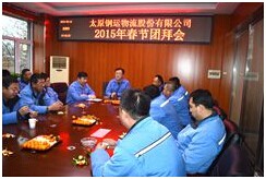 2015年2月19日,公司召開春節(jié)團(tuán)拜會。公司總經(jīng)理胡永生代表董事會向全體職工及家屬送上誠摯的春節(jié)祝福,同時各部門各分公司經(jīng)理也表達(dá)出對鋼運物流的深切祝福。會后,總經(jīng)理助理尹躍飛、郝建國深入現(xiàn)場慰問一線職工。