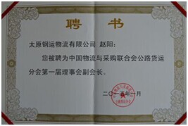 2015年3月5日受中國物流與采購聯(lián)合會邀請,公司總經(jīng)理胡永生赴上海參加中國物流與采購聯(lián)合會公路貨運分會一屆二次理事會。我公司被大會選為“中國物流與采購聯(lián)合會公路貨運分會副會長單位”,公司董事長趙陽被聘為公路貨運分會****屆理事會副會長。