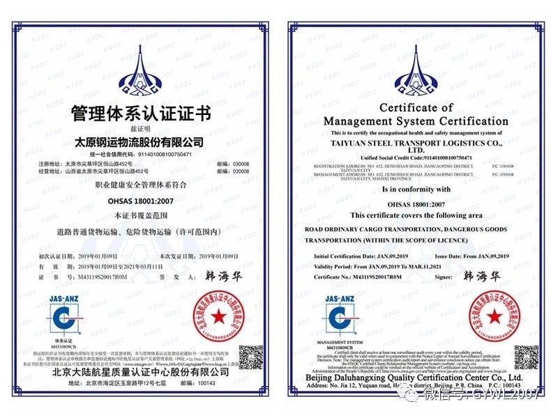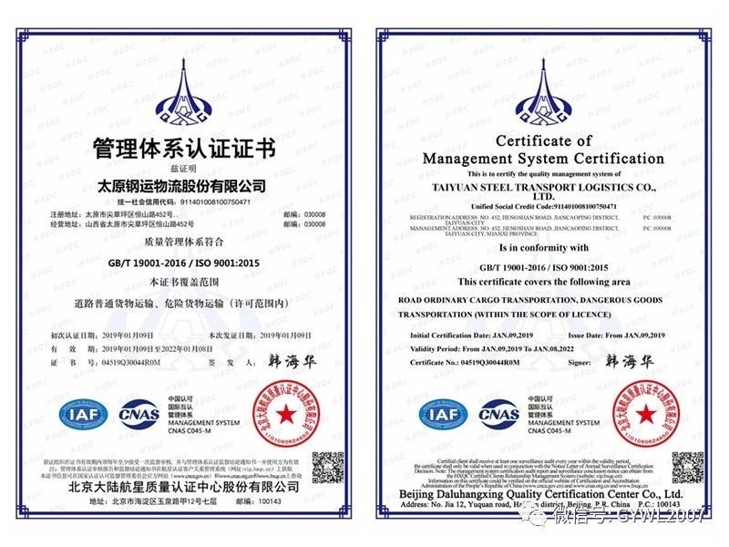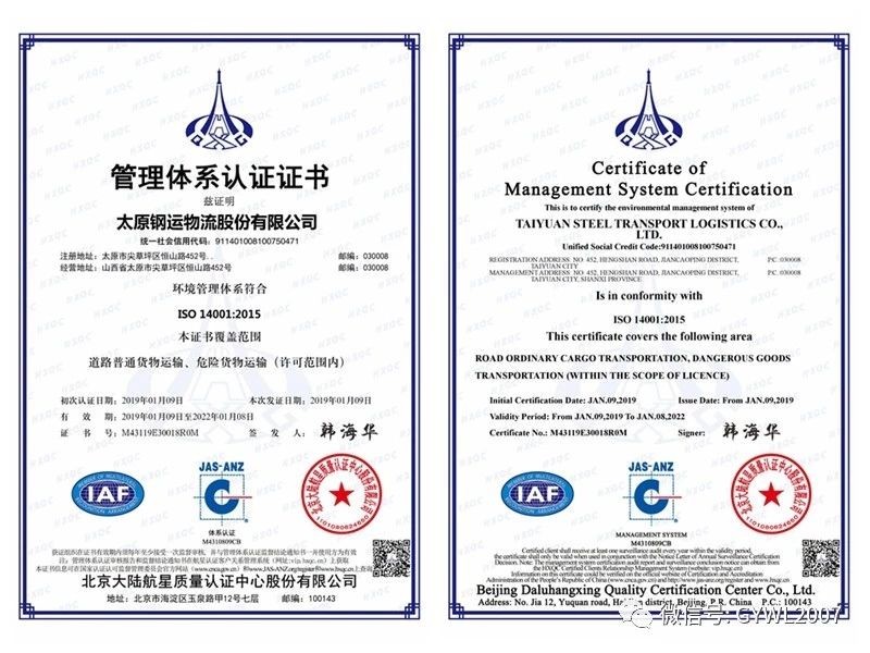 2019年1月,公司通過ISO9001質(zhì)量管理體系、ISO14001環(huán)境管理體系、ISO18001職業(yè)健康安全管理體系認證。ISO三標一體認證的通過,標志著公司始終踐行推進冶金物流服務本質(zhì),持續(xù)強化以用戶為中心的服務理念;充分反映公司全力打造綠色****物流企業(yè)發(fā)展規(guī)劃的堅定決心,同時通過提高職業(yè)健康安全管理水平、優(yōu)化管理流程、完善管理體系、規(guī)范作業(yè)標準等手段提升公司競爭力,為公司開拓市場、永續(xù)發(fā)展提供了有力保障。